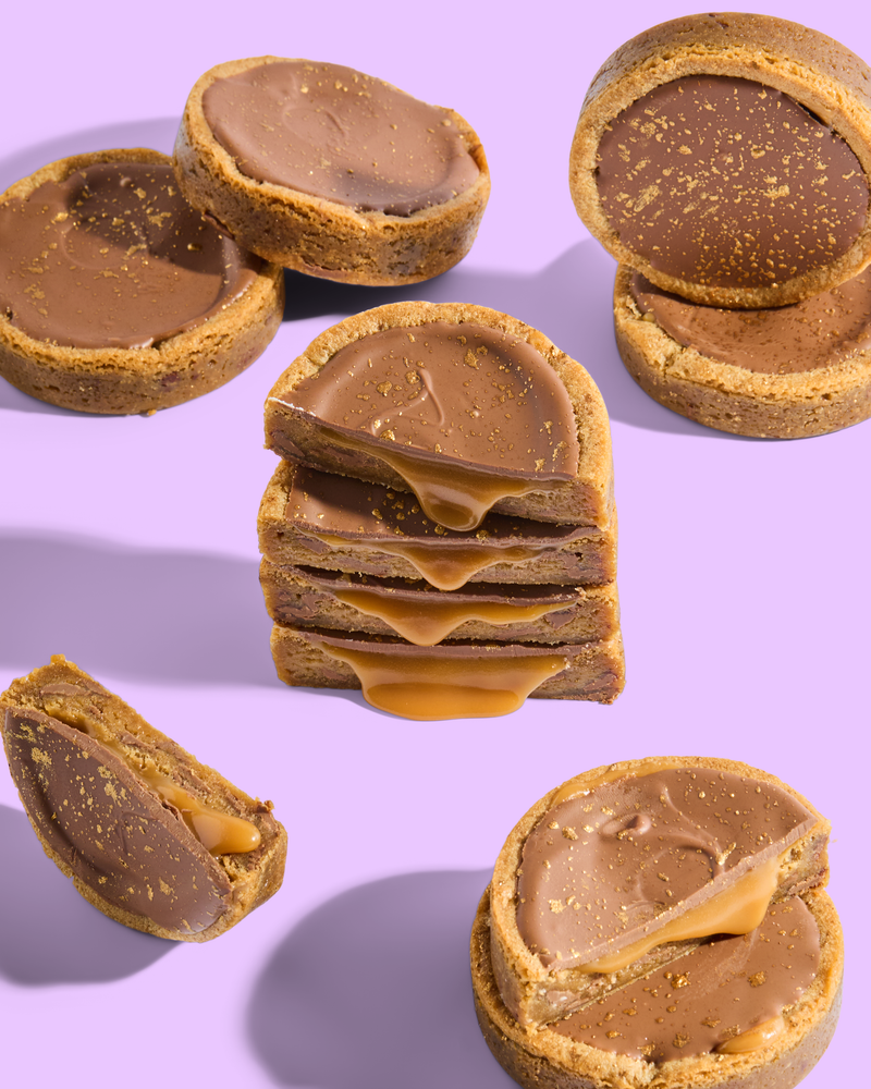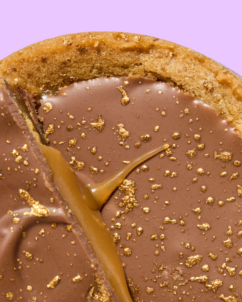 Our take on the millionaire shortbread! The classic G.O.A.T. cookie dough, filled with our signature salted caramel, topped with tempered Freia milk chocolate, and a dusting of gold on top!